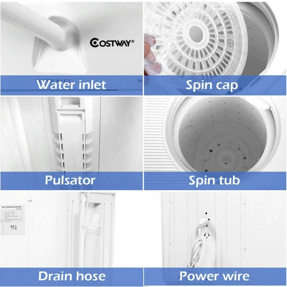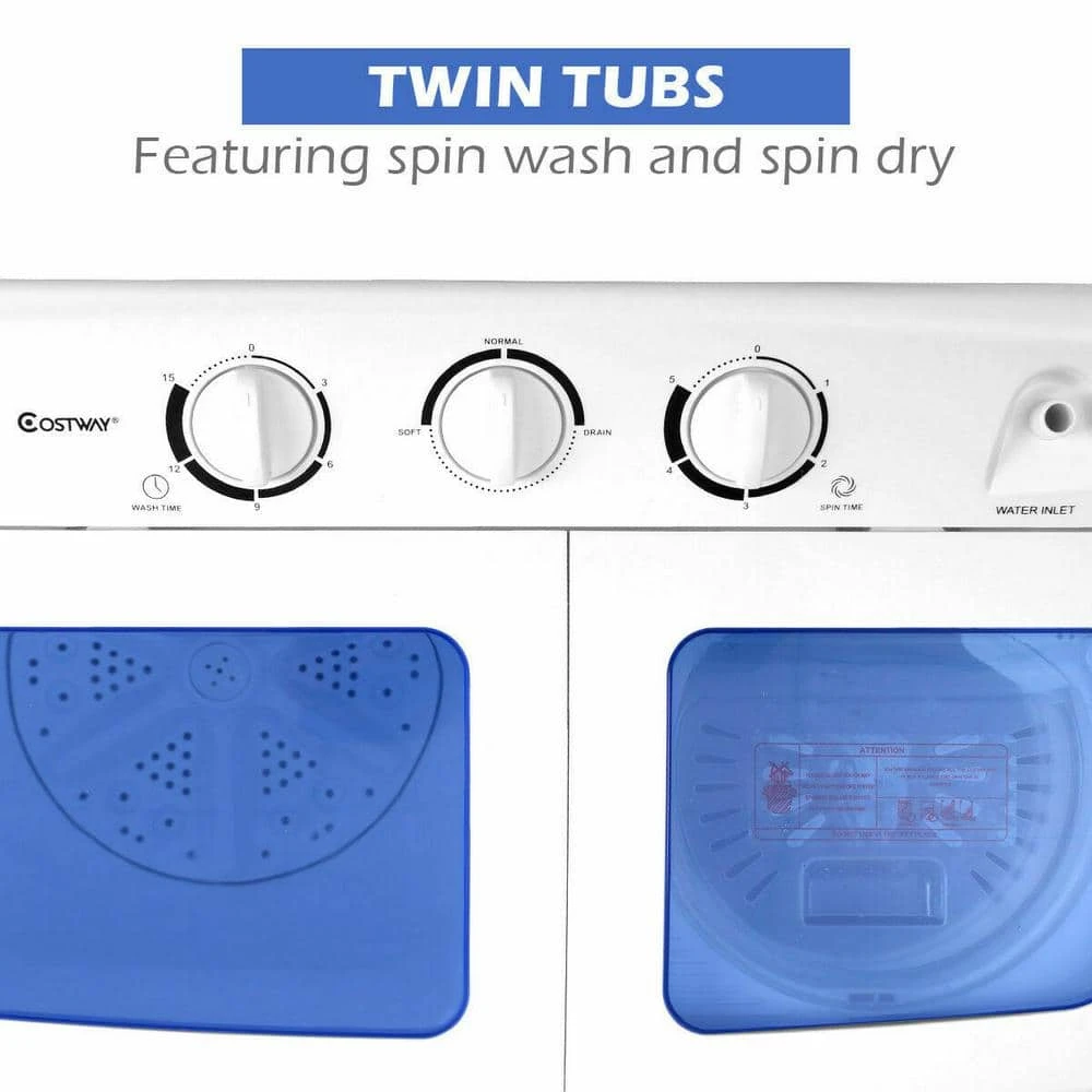 Our Compact Twin Tub Washing Machine, which is prefer for doing laundry in a compact environment. As for a Portable Washing Machine, this washing machine will be ideal for dorms, apartments, condos, motor homes, camping and more. Note: gravity drain.