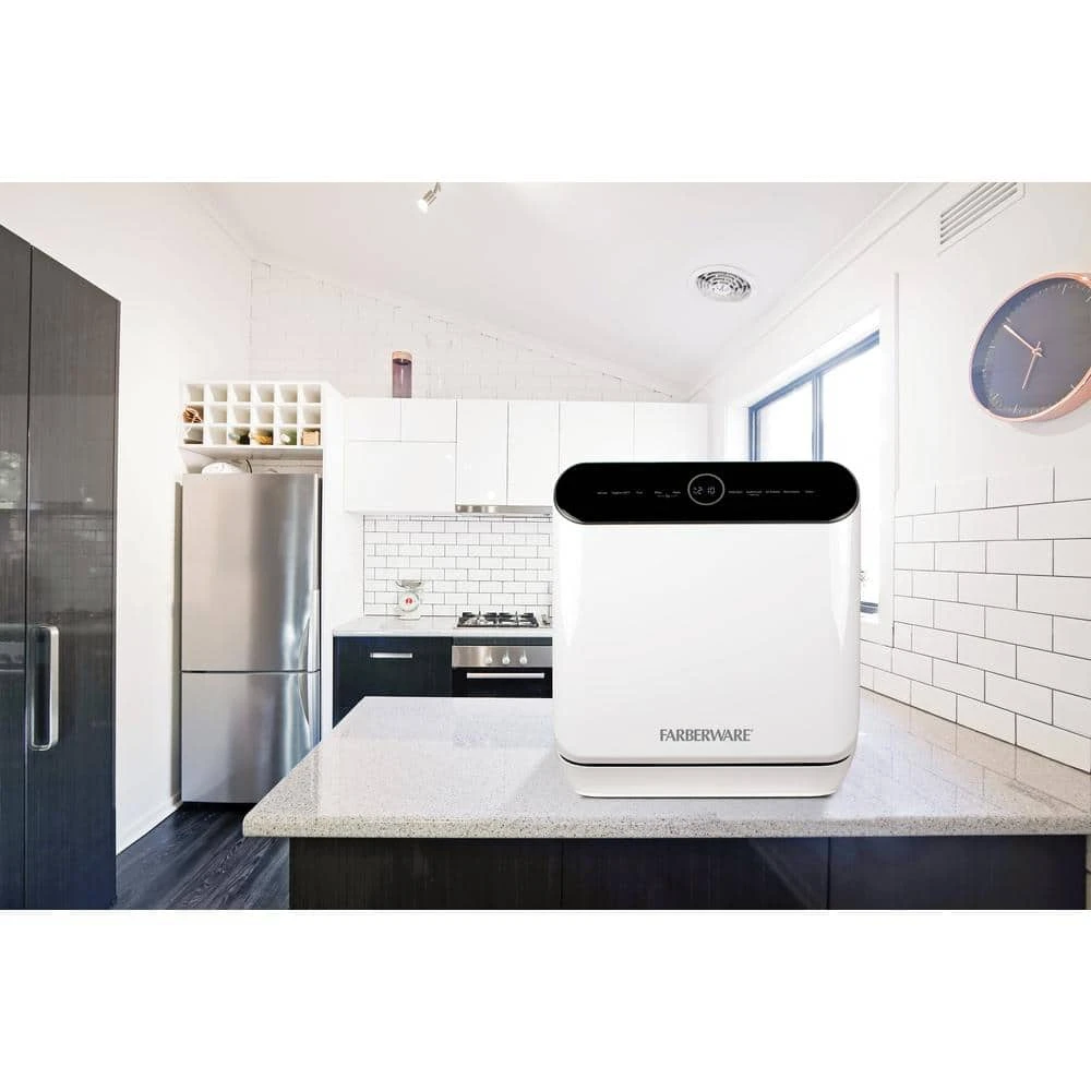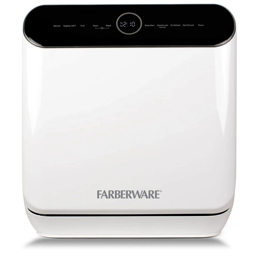 The Farberware Complete Portable Compact Countertop Dishwasher is the perfect solution for smaller kitchens, apartments, RVs, or anywhere you are short on space. If you have water, electricity, and 40 minutes – you can clean your dishes. with a two place setting capacity, five wash programs, and sleek digital touch controls, this countertop dishwasher is a hand washer’s dream come true. The Farberware countertop dishwasher uses high pressure dual spray to efficiently clean dishes using less water than hand washing or traditional built-in dishwashers. A child lock is included for extra peace of mind.