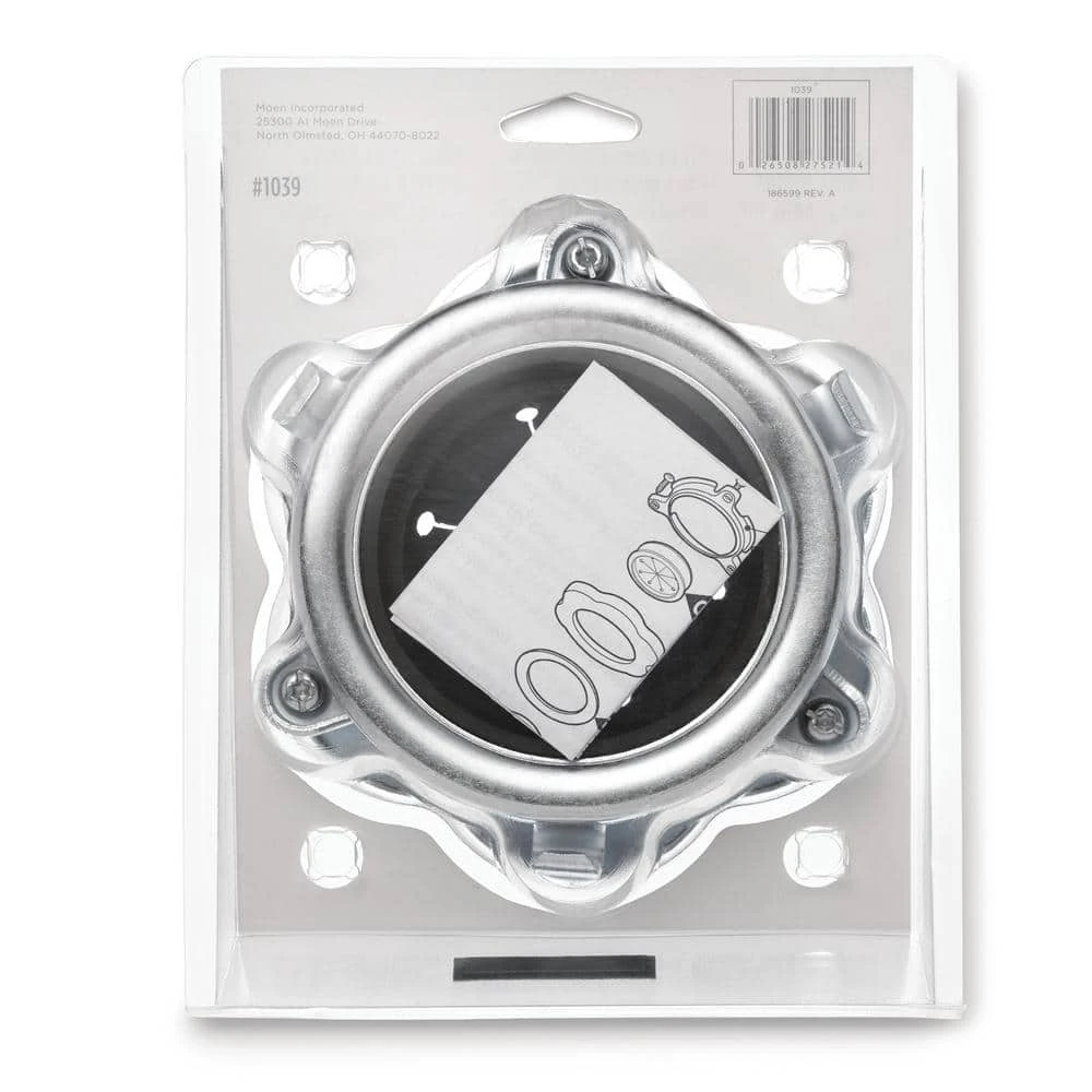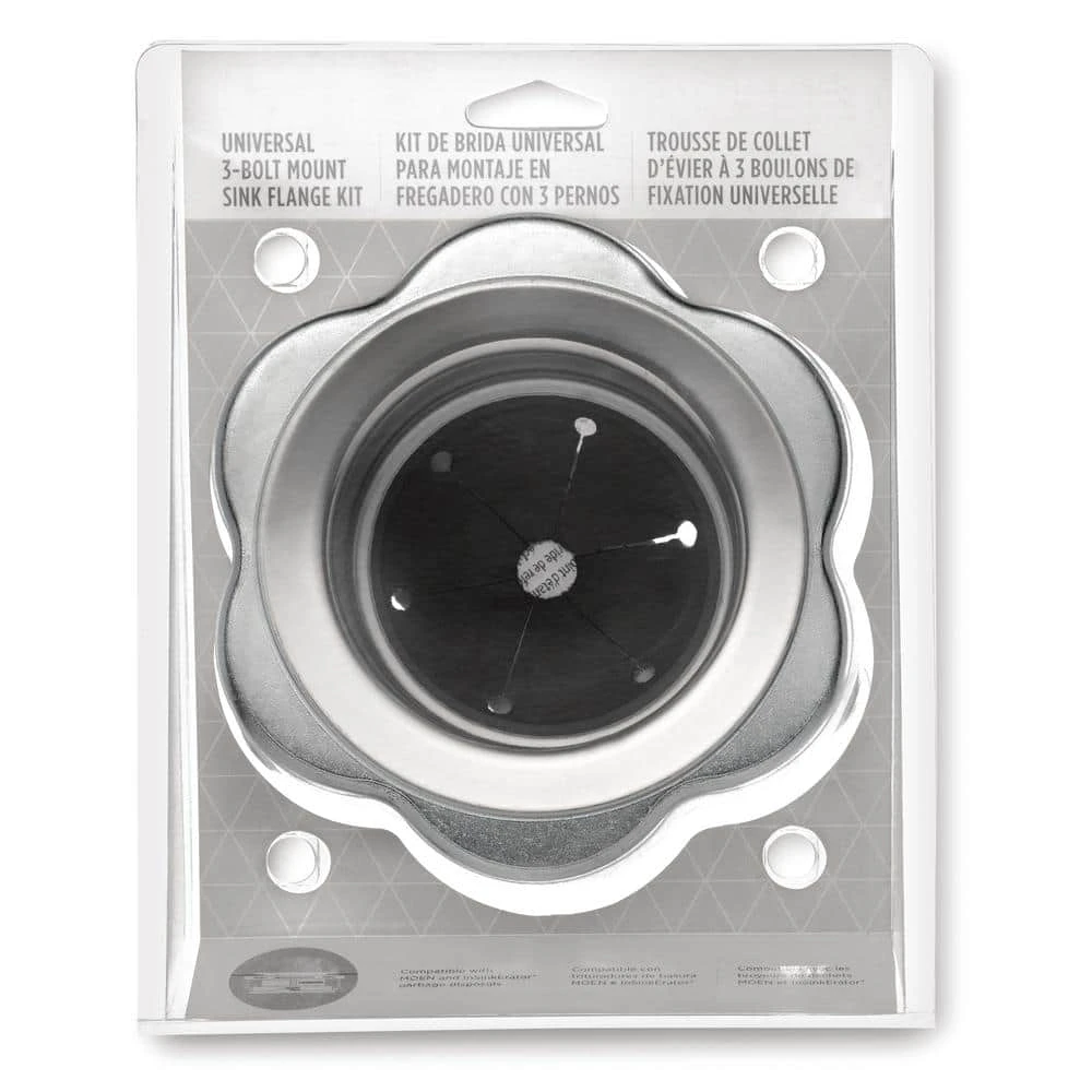 The Universal 3-Bolt Mount Sink Flange Kit is compatible with Moen and InSinkErator branded garbage disposals. This design features a polished stainless steel mounting assembly that is easy to twist on during installation. The splash guard is also integrated in the sink flange kit for convenience.