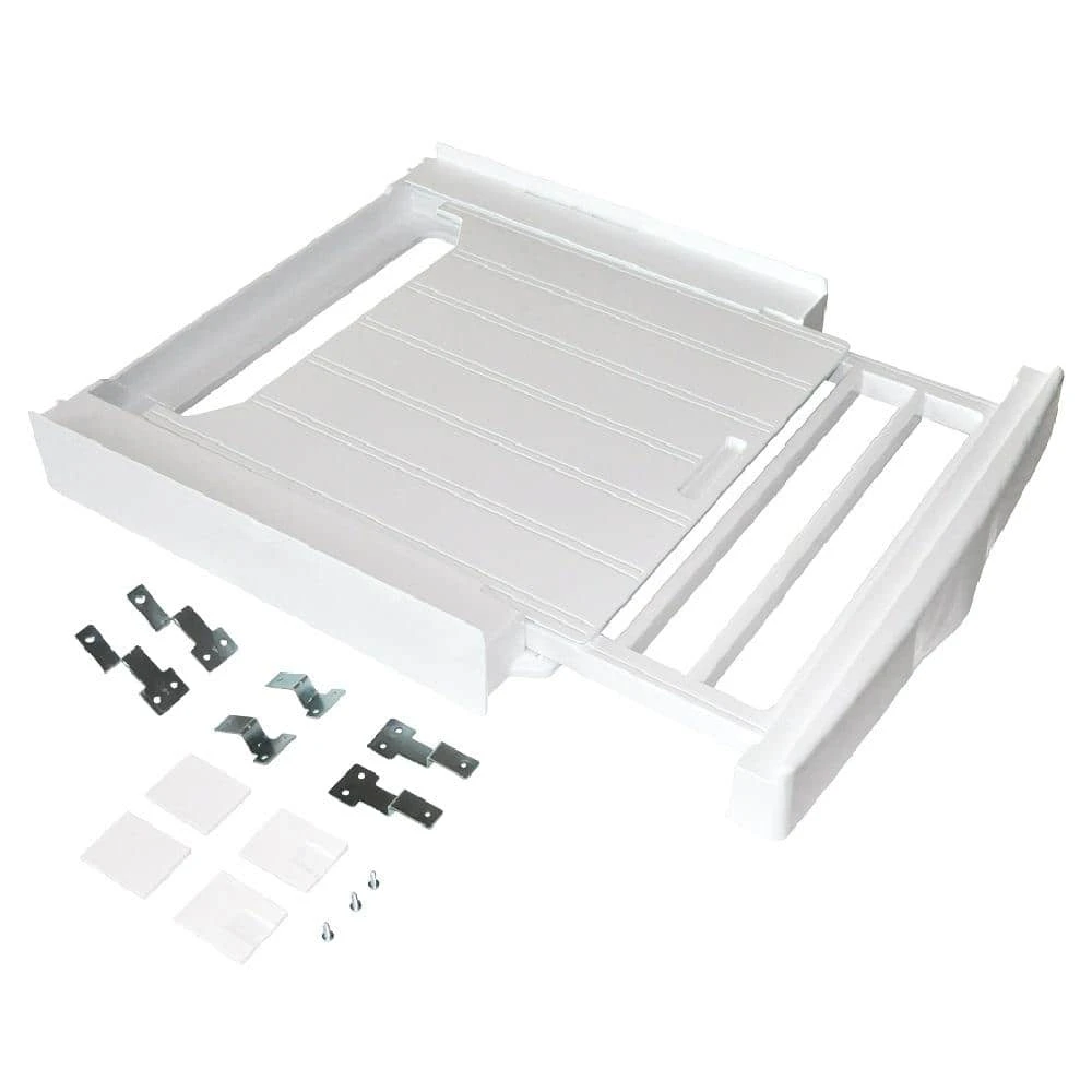 This 24 in. stack kit has a two in one function for compact washer and dryers. It comes with a retractable sliding shelf where you can store your folded clothes. There is also a retractable hanging rack function to hang your clothes to dry. All you have to do is slide back the shelf to uncover the hanging rack.